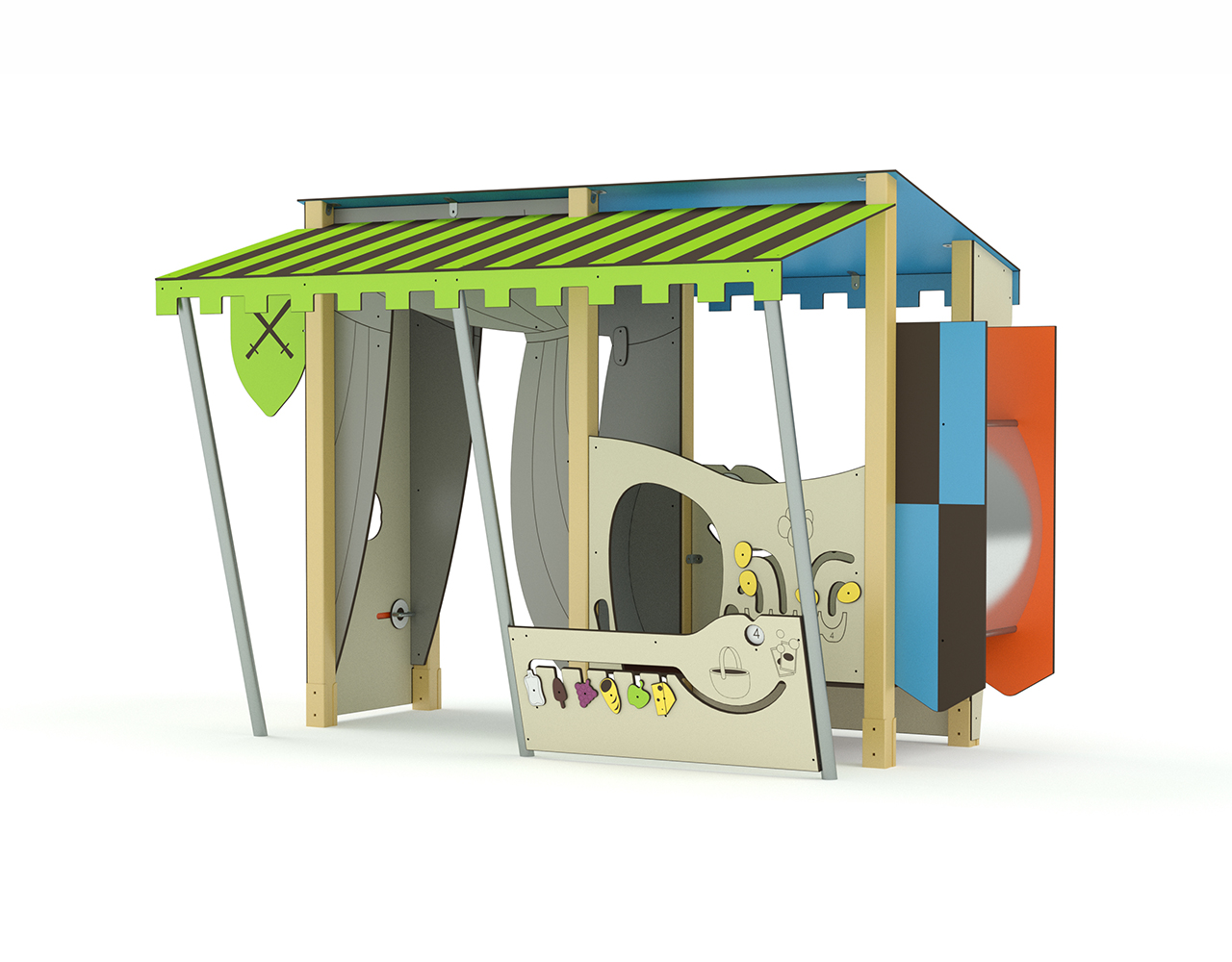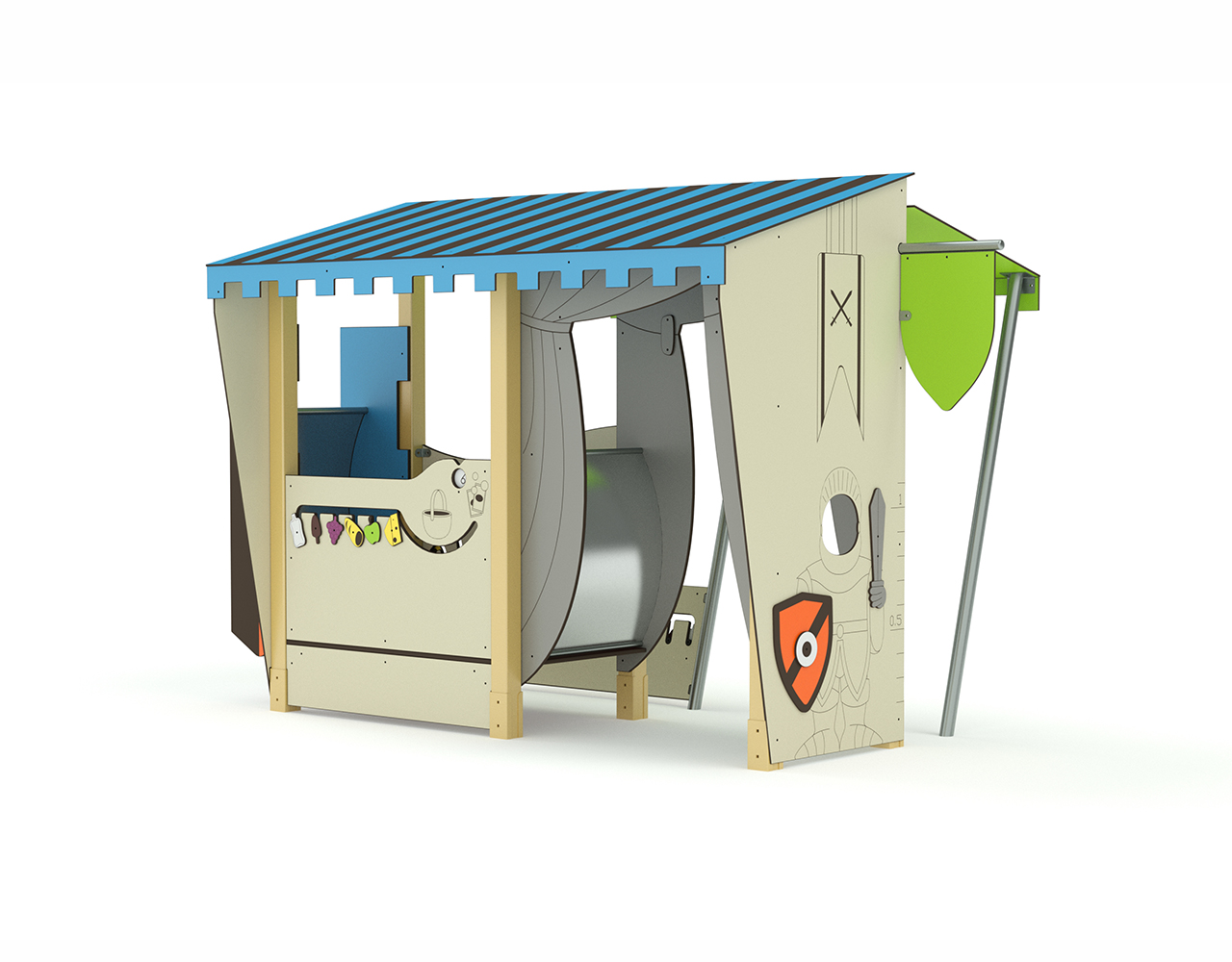 Cette cabane, inspiration échoppe médiévale, enchantera les enfants dès l’âge de 1 an avec ses nombreux éléments ludiques. Elle leur permettra notamment de développer leur imagination et leur créativité en s’imaginant marchand à l’époque médiévale. Pouvant accueillir jusqu’à 20 petits marchands en même temps, elle leur donnera l’occasion de se rencontrer et de développer leur sociabilisation.