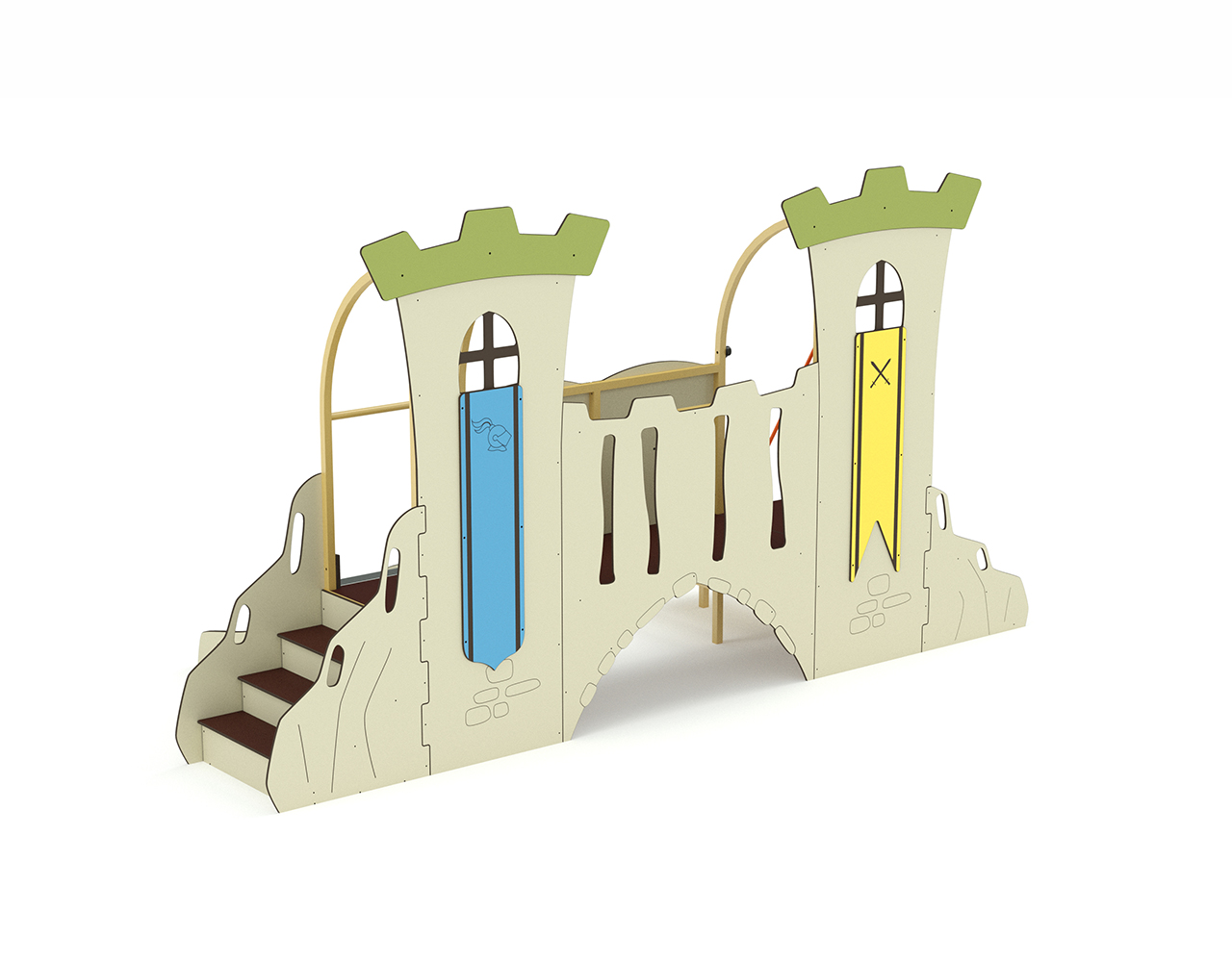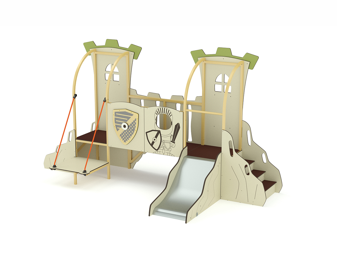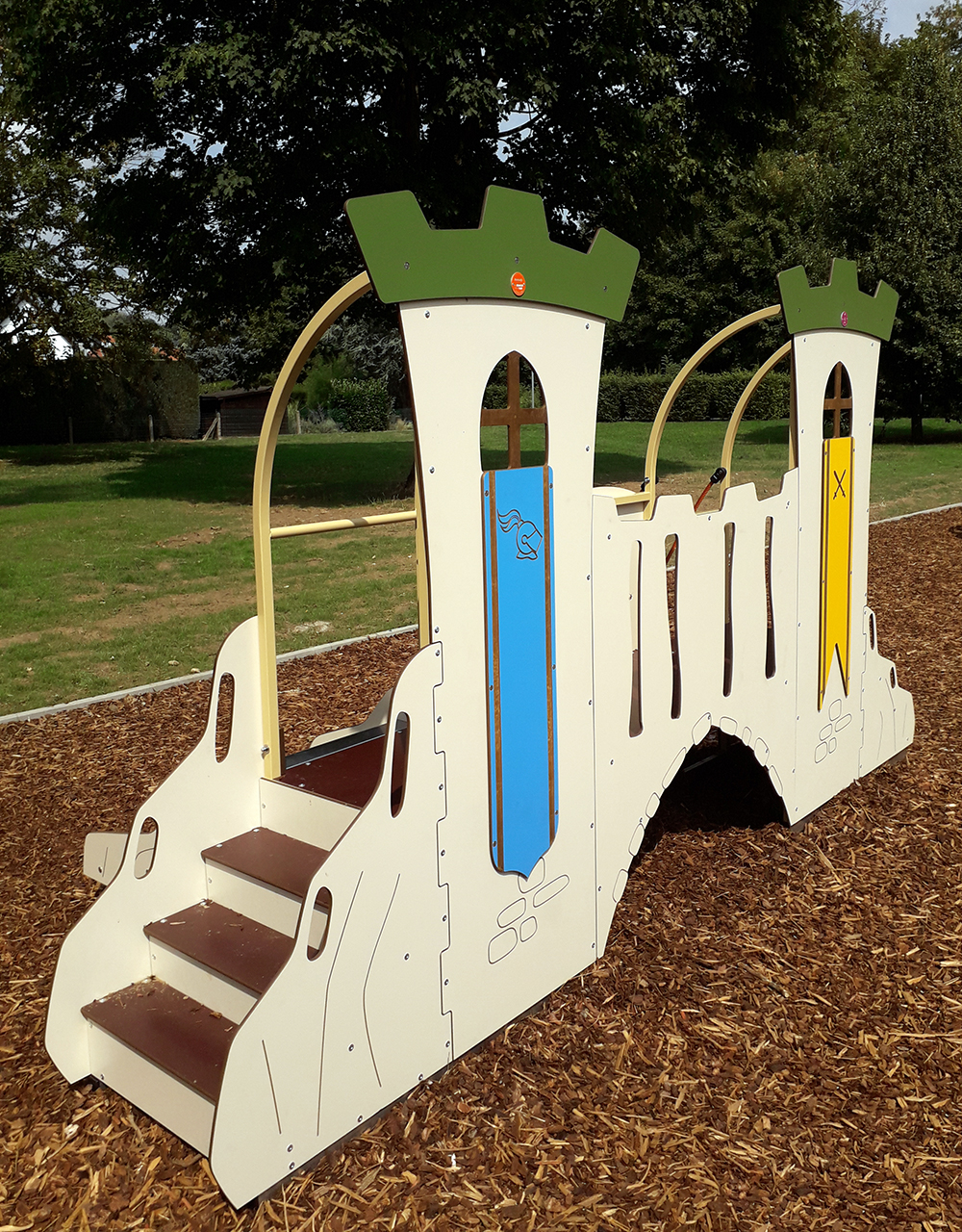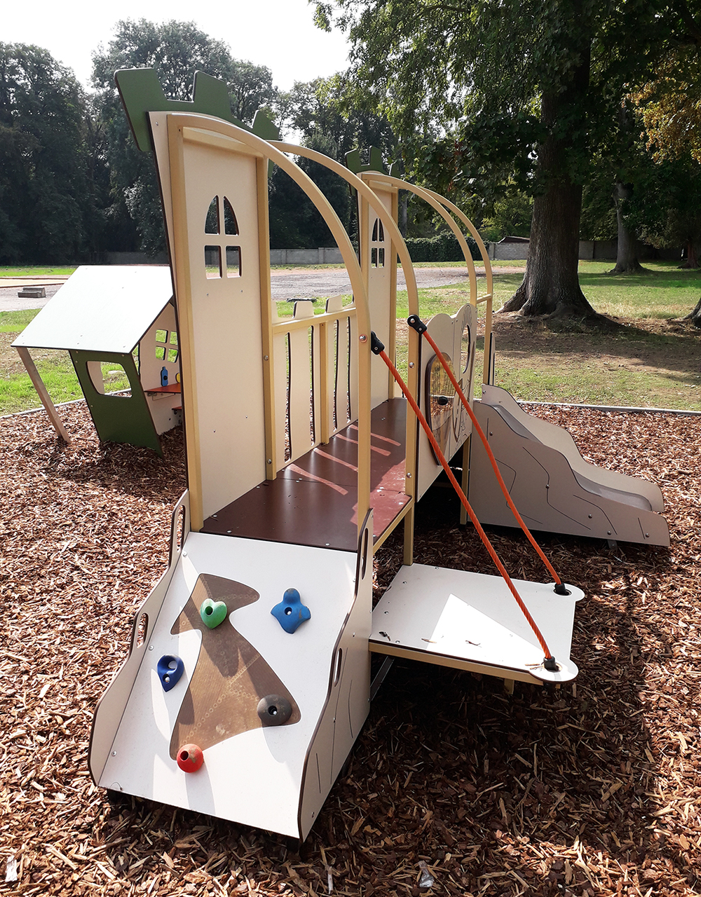 La cabane Château – 2 tours possède un design médiéval composée d’une rampe d’escalade inclinée, d’un escalier, d’une rampe à grimper, d’un toboggan, d’une passerelle de garde ainsi que de panneaux ludiques. Idéal pour les jeunes enfants de 1 à 6 ans, elle permettra d’éveiller leur imagination et d’aller à la rencontre des autres enfants.