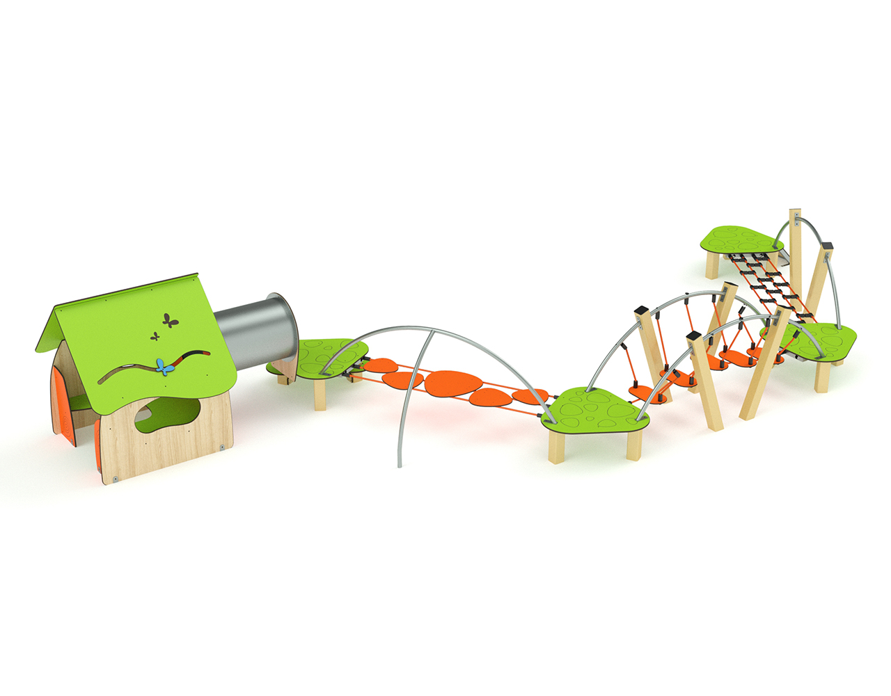 La cabane Alix, accessible dès 1 an, se prolonge d’un parcours d’équilibre qui offre aux enfants à partir de 2 ans, la possibilité de travailler leur stabilité et leur coordination tout en s’amusant. Le cheminement de galets en galets pour atteindre l’autre côté du parcours ludique leur donnera un sentiment de progression et d’accomplissement très satisfaisant. Totalement personnalisable, cette traversée peut être associée à d’autres Traversées ludiques pour enrichir l’expérience des enfants.