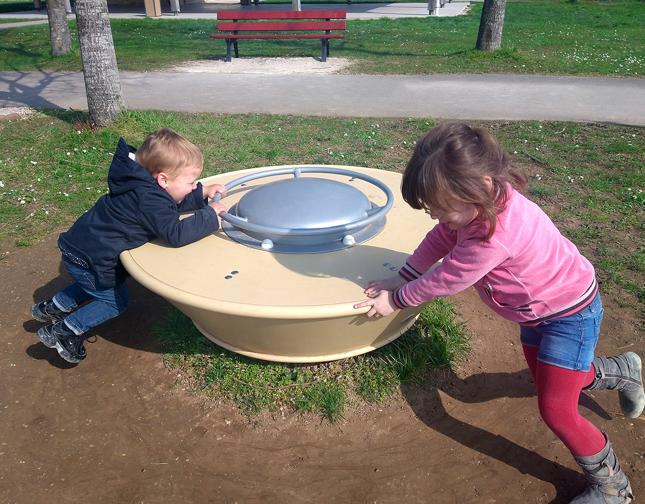 Le manège Polux permet de tournoyer seul ou à plusieurs en toute sécurité. Son petit diamètre permet une zone de sécurité réduite, et s’adapte donc aux petites aires de jeux. Dès 3 ans.