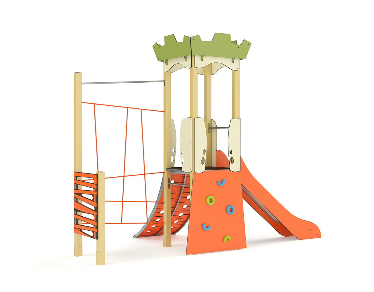 Mon château – 1 tour – Filet est une structure sur le thème médiéval. Elle se compose d’une tour centrale et son plancher à 1.35 m de hauteur, autour de laquelle s’articulent les agrès de grimpe (pont-levis, traversée filet, mur d’escalade, panneau à grimper) et un toboggan. Adaptée aux enfants à partir de 2 ans , elle peut accueillir jusqu’à 23 petits chevaliers à la fois.